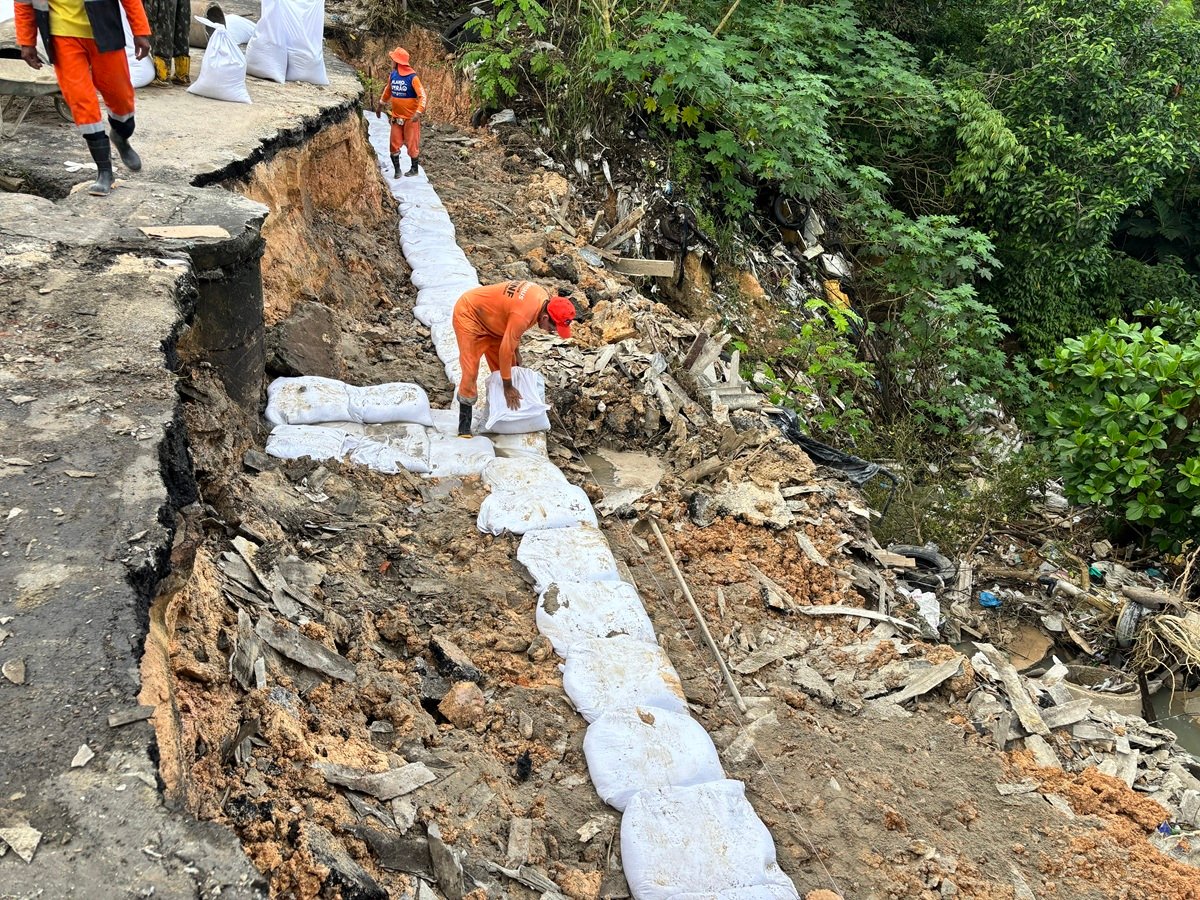 As equipes iniciaram os serviços na rua Santiago, onde parte da via cedeu e foi agravada pelo descarte irregular de lixo. Após a limpeza completa da área, começou o processo de estabilização com rip-rap, técnica que utiliza sacos de cimento e areia que, ao serem umedecidos, formam uma estrutura rígida de contenção. Em sequência, será realizada a recuperação da rede de drenagem profunda e superficial para garantir o escoamento das águas pluviais e prevenir novos deslizamentos.